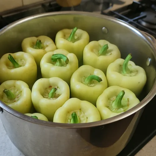 6. Papriky poukladajte do širšieho hrnca a zalejte pripravenou omáčkou. Ak treba, dolejte vodou, aby boli do ⅔ ponorené.